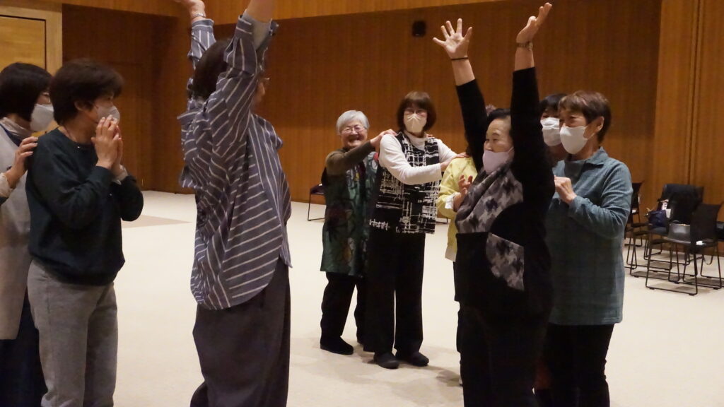 1日目の研修会は農協2階ホールにて「身体を使った運動・遊び」として、士幌町社会福祉協議会より保健師と理学療法士を1名ずつお招きし開催致しました。中でも身体を使ったじゃんけん遊びである「じゃんけん列車」は、部員同士がじゃんけんを行い負けた者が後ろについて列車上に連なっていくルールであり、交流も兼ねた研修会となりました。